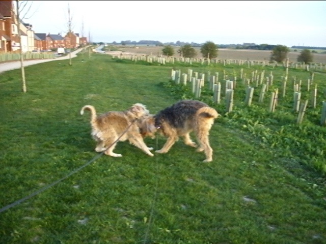 However, part way home Rosie decided to tempt Rocky into a game by laying on the ground and woofing at him .....